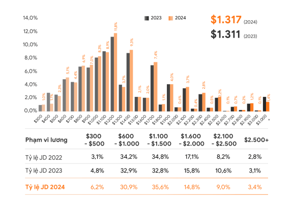 Thị trường việc làm IT tại Việt Nam đang chứng kiến sự bùng nổ chưa từng có, đặc biệt trong các lĩnh vực như trí tuệ nhân tạo (AI), dữ liệu lớn (Big Data), điện toán đám mây, và an ninh mạng. Nhu cầu tuyển dụng nhân sự công nghệ cao đang tăng mạnh, với mức lương cho các chuyên gia trong các lĩnh vực này liên tục gia tăng. Theo Báo cáo, mức lương trung bình của lập trình viên tại Việt Nam vào năm 2024 ước tính dao động từ 1.100 đến 3.000 USD mỗi tháng, tùy thuộc vào kỹ năng và kinh nghiệm. Đặc biệt, các vị trí chuyên sâu như kỹ sư AI và chuyên gia bảo mật thông tin có thể nhận được mức lương vượt xa con số trung bình, nhờ vào sự khan hiếm nhân lực và tầm quan trọng của những vai trò này trong các doanh nghiệp.