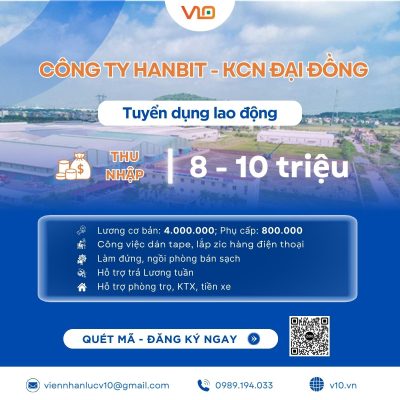 HANBIT [KCN Đại Đồng] – TUYỂN DỤNG 500 LAO ĐỘNG NỮ 🔻Công việc: >> Dán tape, lắp zic hàng điện thoại >> Làm đứng, ngồi phòng bán sạch, không...